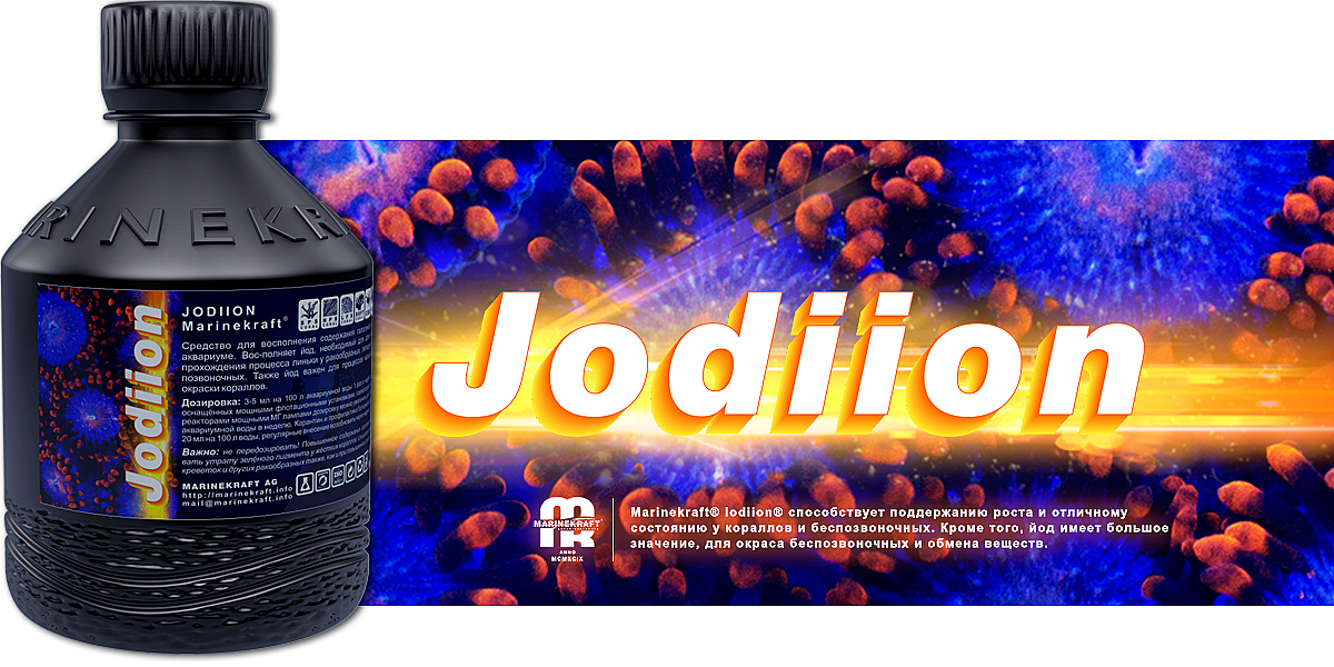 В морском аквариуме, йод является очень важным элементом, поскольку он необходим для нормального прохождения процесса линьки у членистоногих (раки, крабы, креветки). Добавки йода способствуют поддержанию роста и отличному состоянию кораллов, а также других беспозвоночных. Кроме того, йод имеет большое значение в процессах синтеза пигментов и обмене веществ. Поскольку из-за окислительных процессов, потреблением йода кораллами и водорослями, а также работы скиммера концентрация йода в морском аквариуме постоянно уменьшается, то для поддержания баланса (восполнения содержания йода в морском аквариуме) рекомендуется восполнять этот галоген добавкой Marinekraft® Jodiion®.